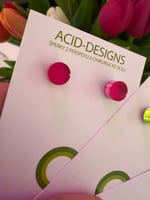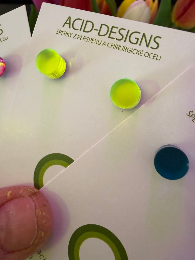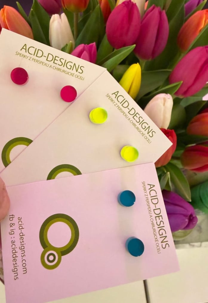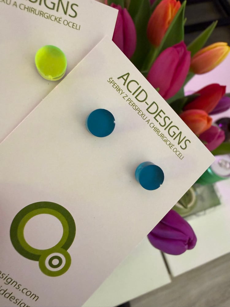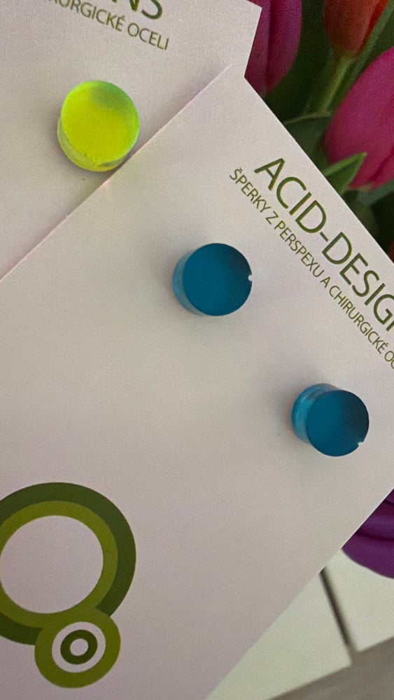 Tyto náušnice jsou vyrobeny ze dvou vrstev – barevného perspexu a zrcadla, díky čemuž mají výraznou barvu a jemné odlesky.