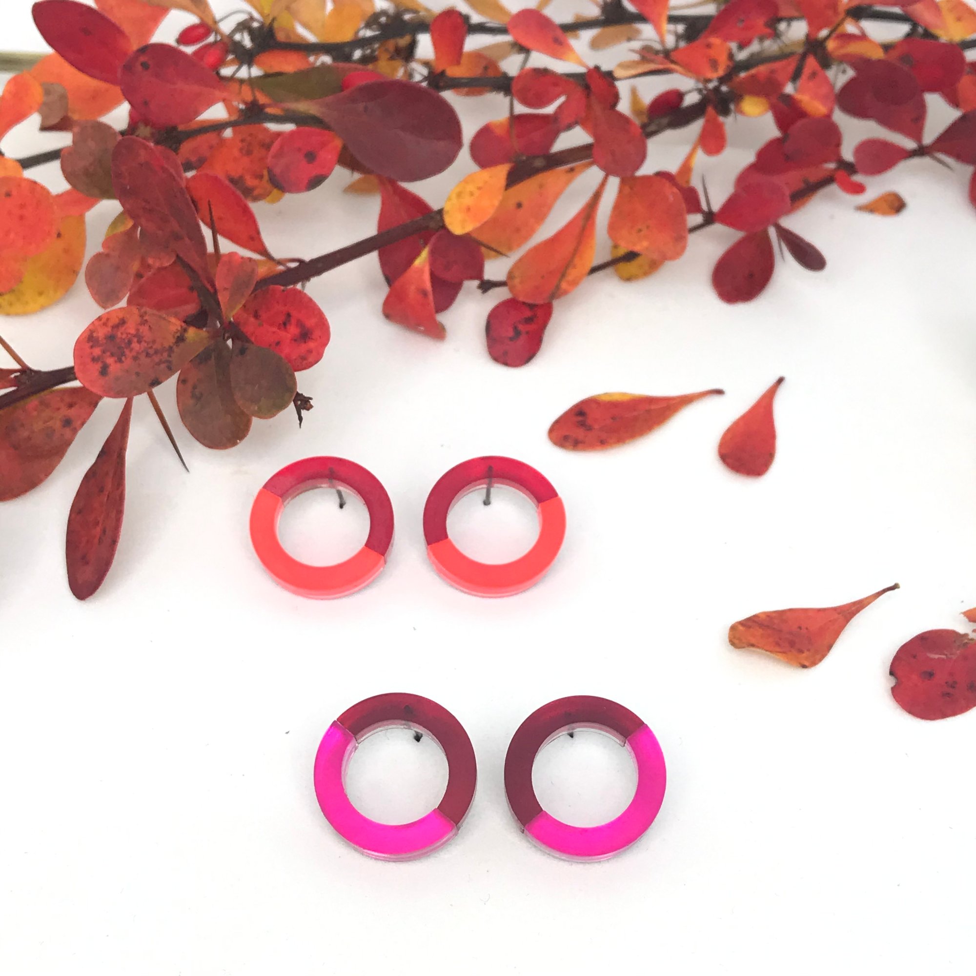Náušnice Doublecircle autumn jsou náušnice kruhového designu v nových barevných kombinacích inspirovaných podzimem - fuksiová růžová s červenou a fluorescentní oranžová s červenou.