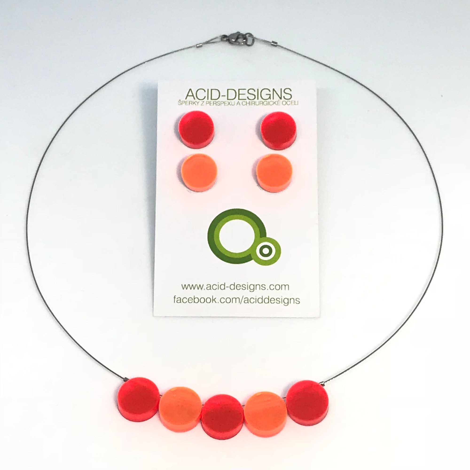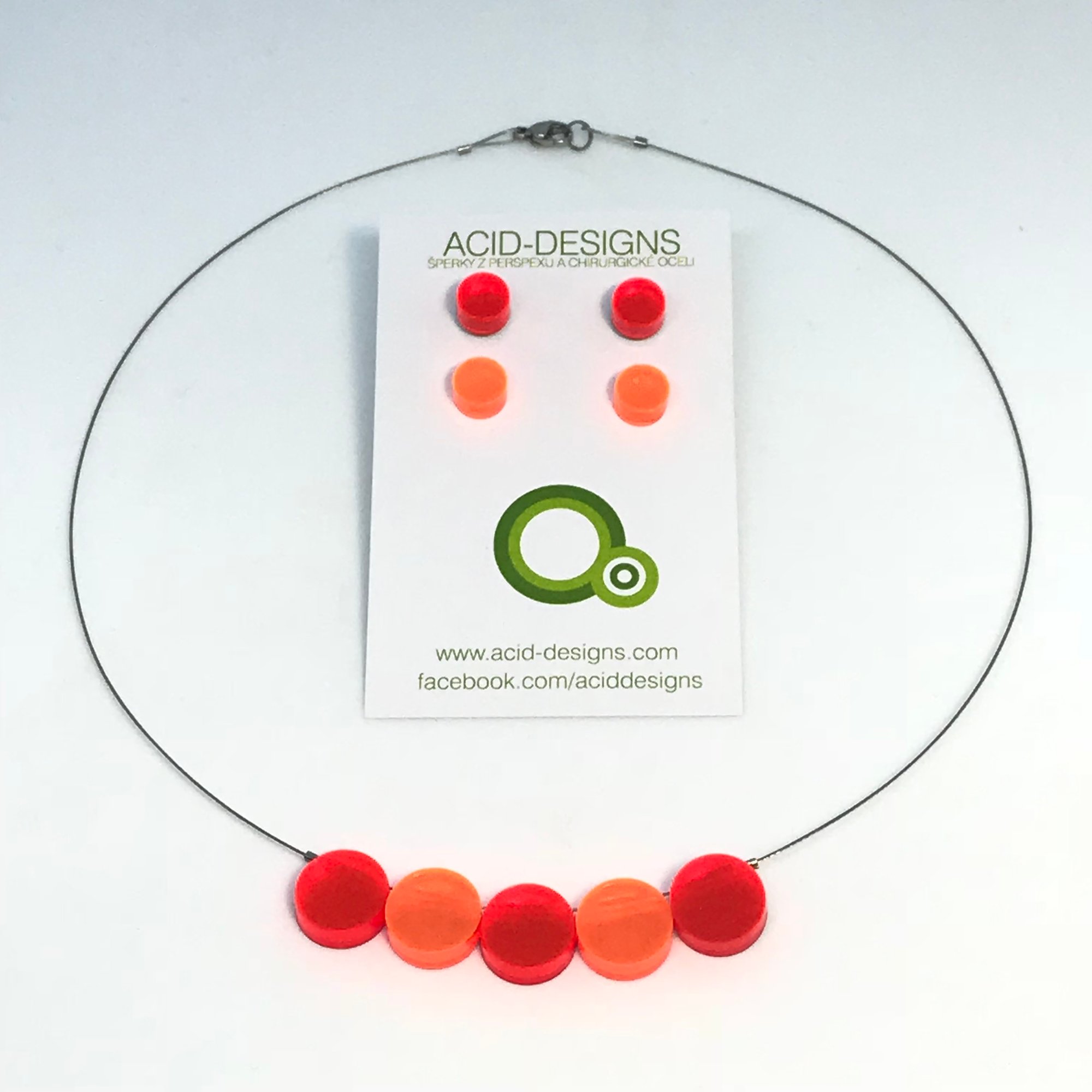 Náhrdelník Circle oranžovo -fluorescentní oranžový je vytvořen z 5 segmentů barevného dvojvrstvého perspexu na japonském ocelovém lanku cca 48cm pokrytého nylonem s komponenty z chir.oceli -hypoalergenní., zavírání je na karabinku a očko.