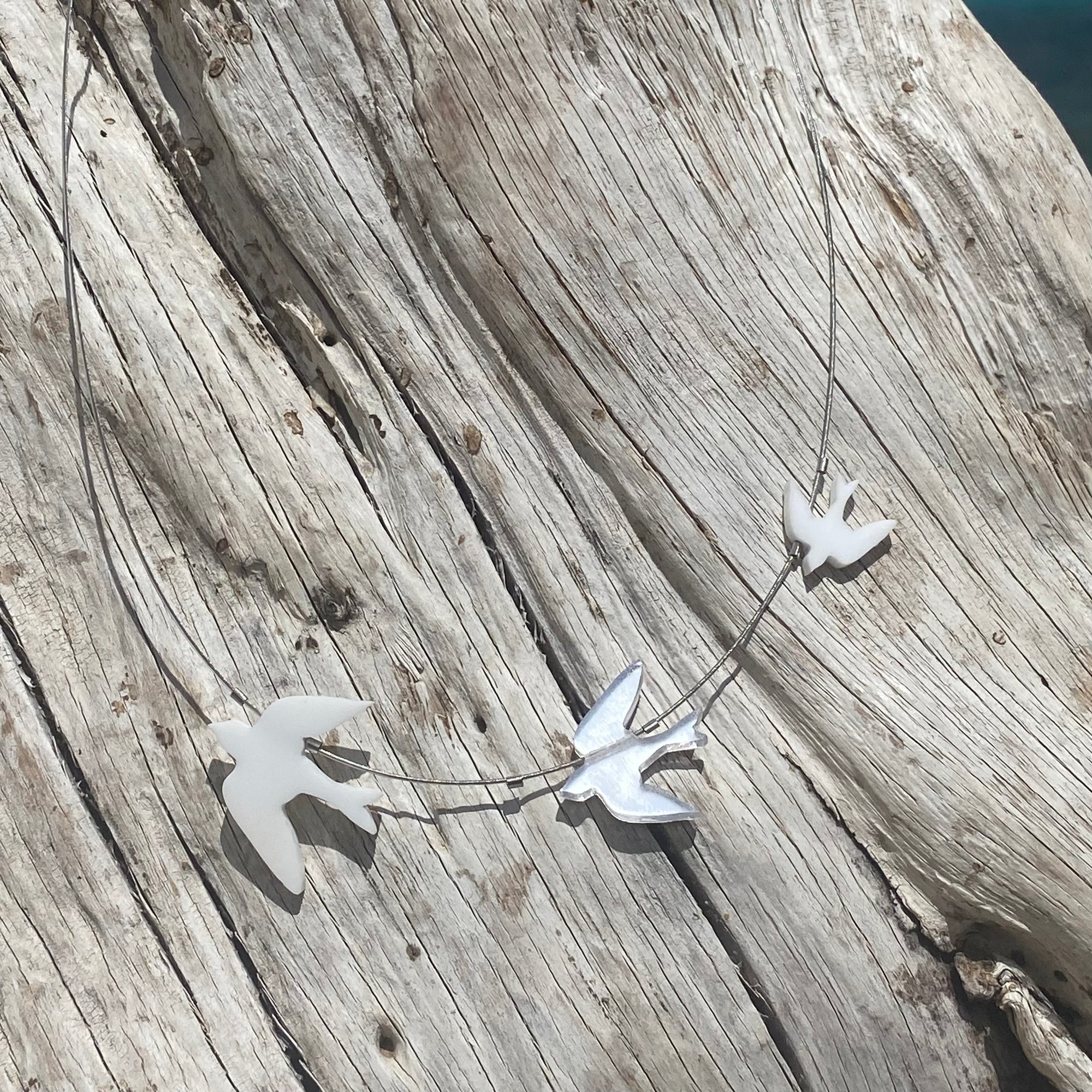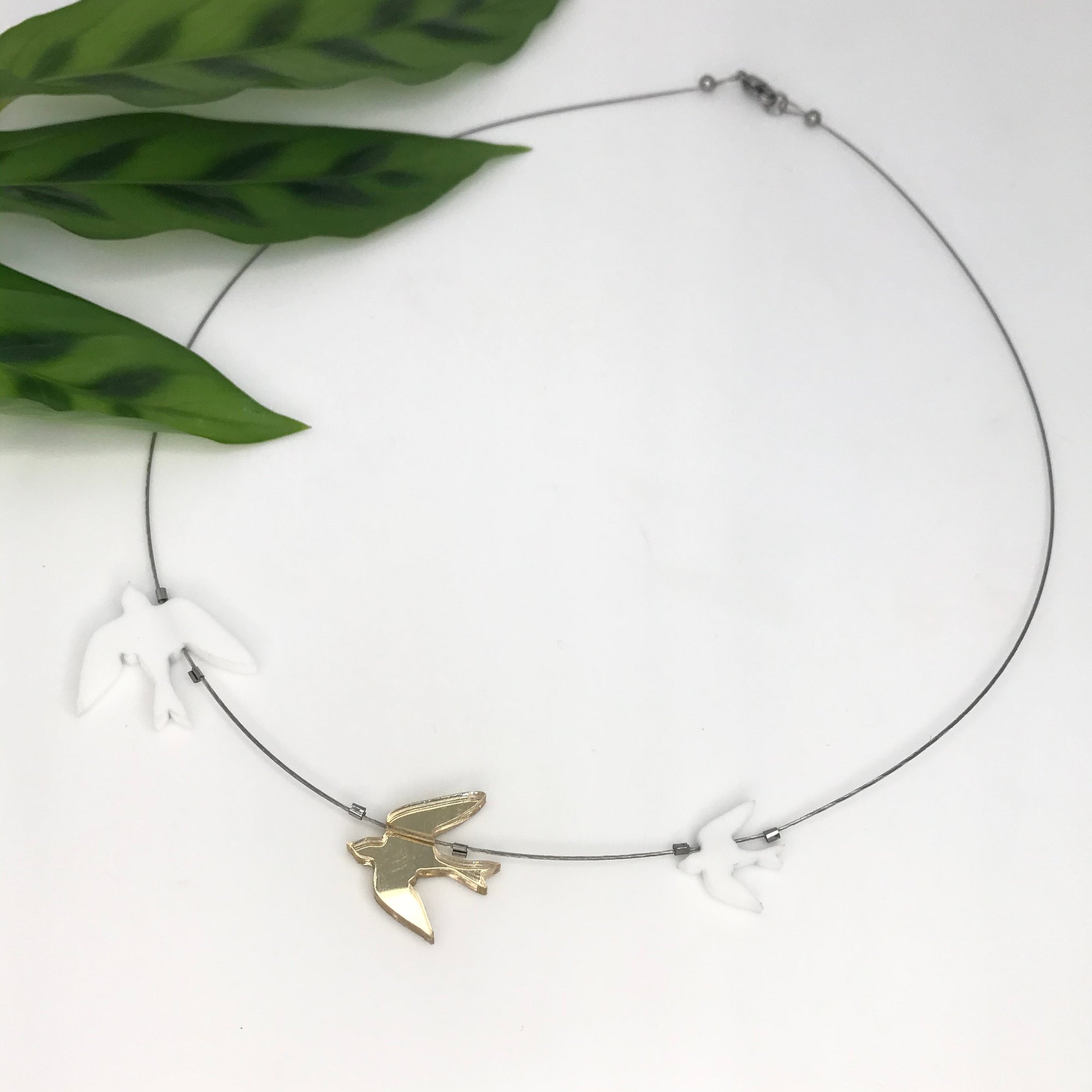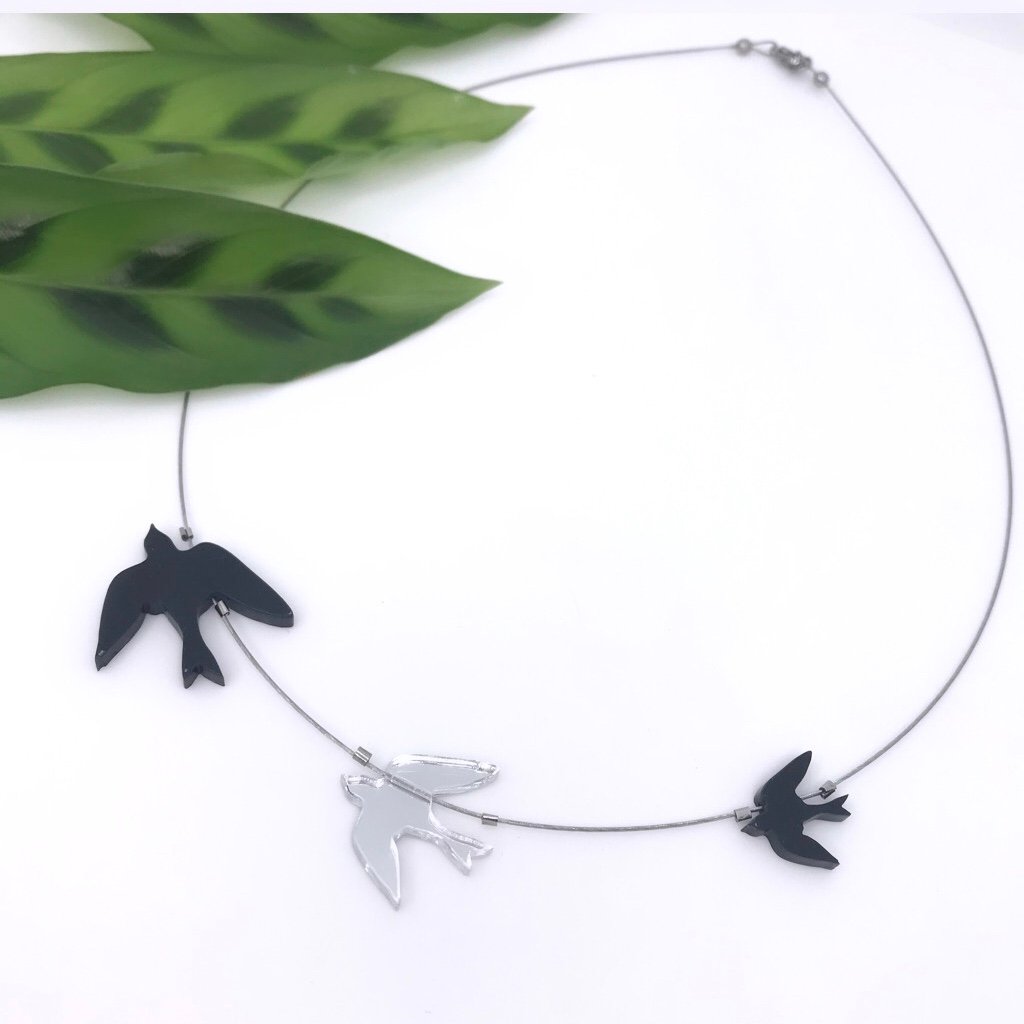 Vyrábím ho z materiálu perspex v těchto barvách :matná černá , matná bílá a stříbrné, zlaté, měděné zrcadlo v lesklém nebo matném provedení, u zrcadlových ptáčků lakuji druhou stranu ochranou vrstvou laku. Ptáčci jsou na kvalitním ocelovém lanku potaženém nylonem s komponenty z chirurgické oceli, zapínání je na karabinku. Na Vaše přání mohu délku lanka upravit. Běžná délka lanka je cca 45cm.