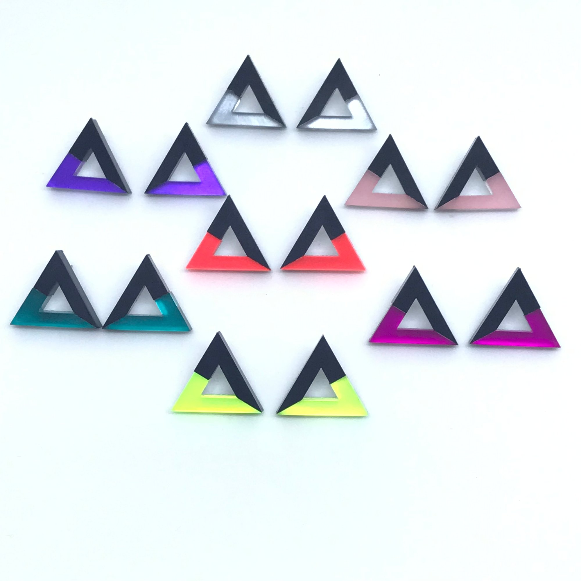 Náušnice ve tvaru trojúhelníku v kombinaci černé a barevné části .
