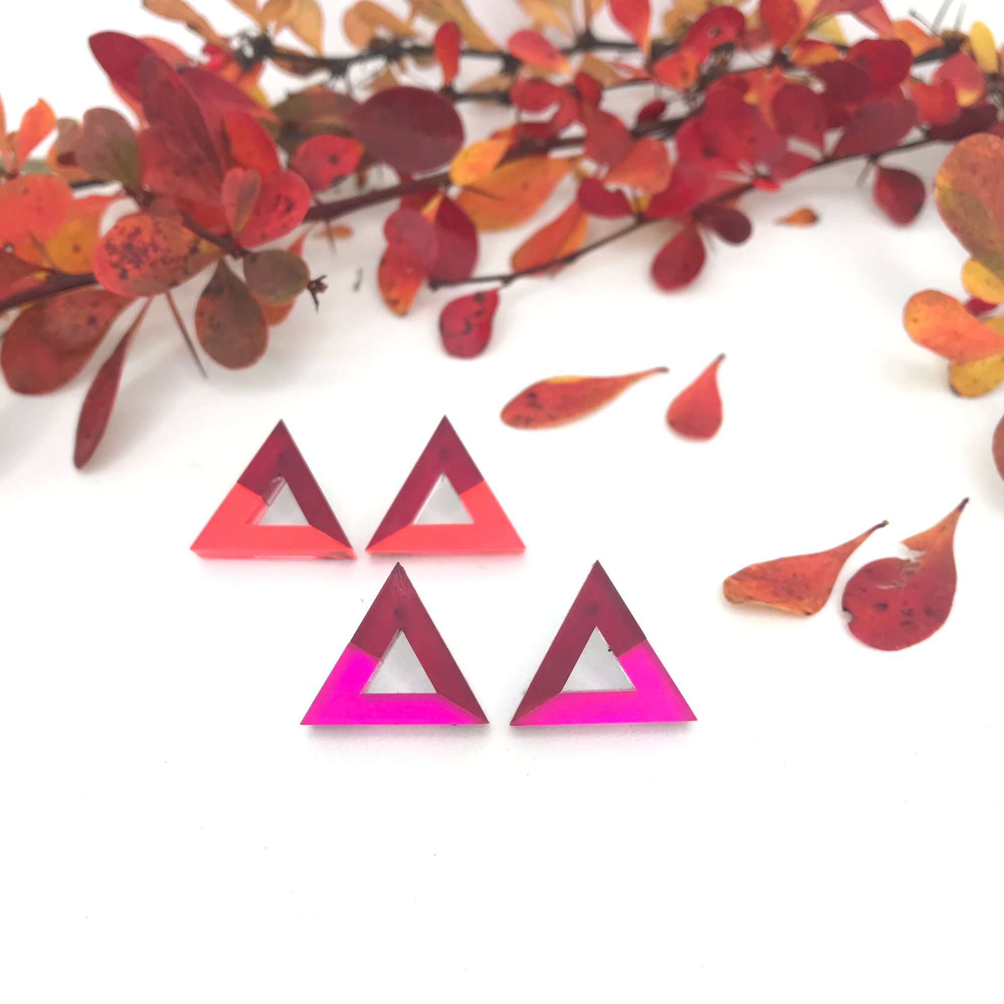 Náušnice ve tvaru trojúhelníku v nových barevných kombinacích inspirovaných podzimem.