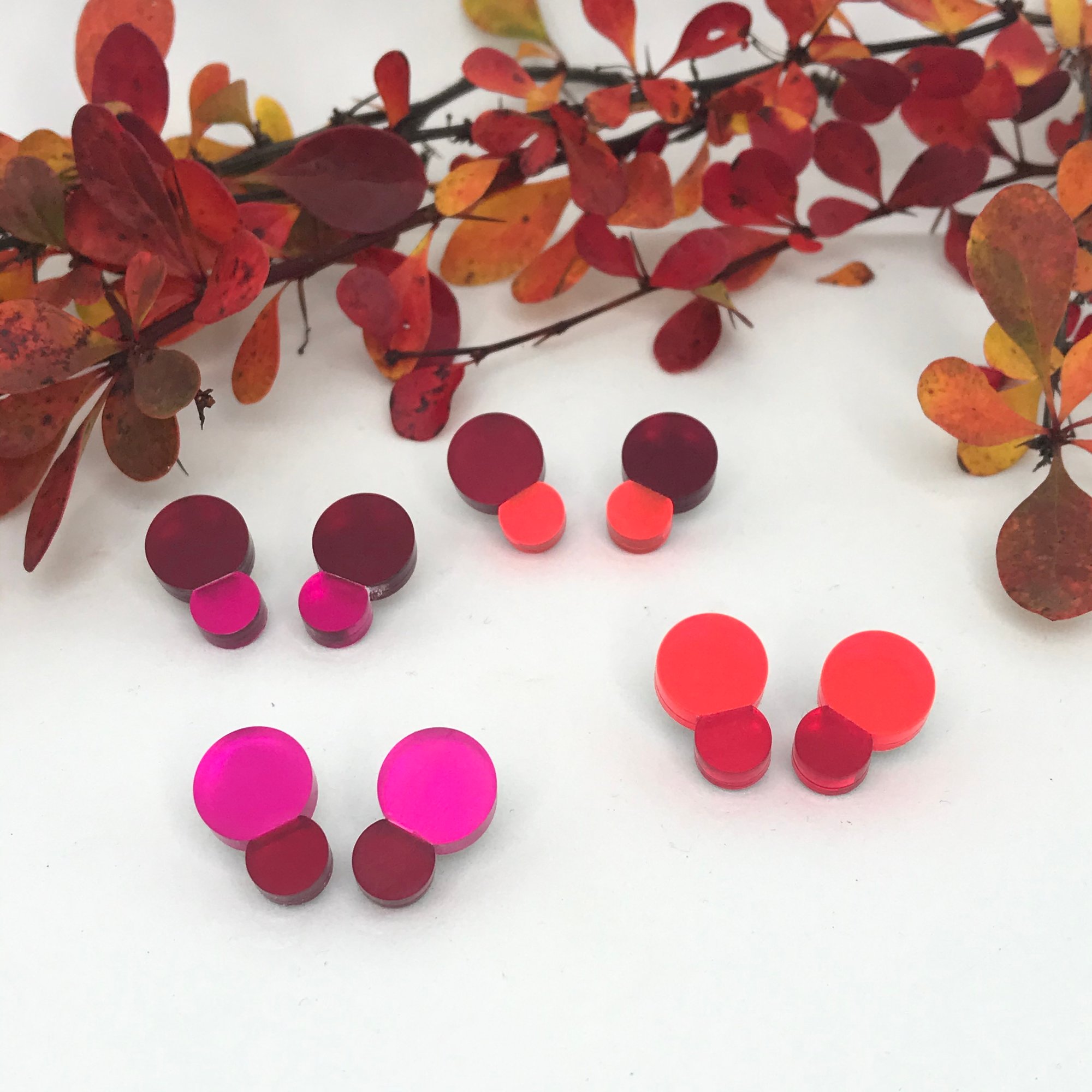 Náušnice ve tvaru dvou spojených bublin v nových barevných kombinacích inspirovaných podzimem. Nově jsou dostupné v kombinacích fluorescentní oranžová - červená a fuksiová růžová - červená.
