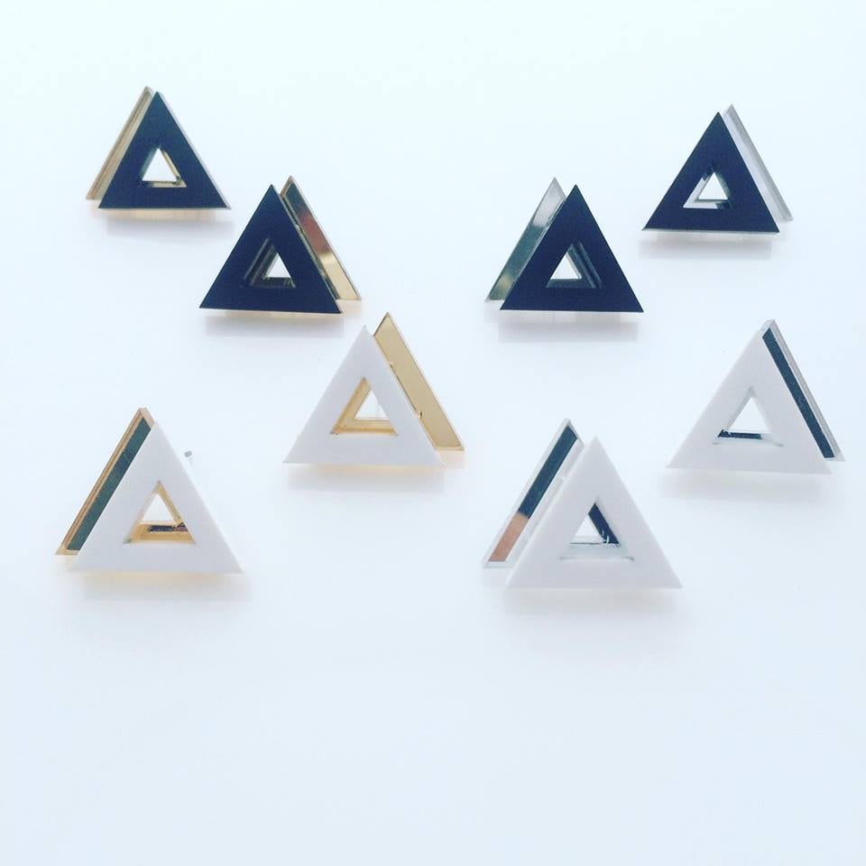 Náušnice Doublemirrortriangle v elegantních kombinacích matné černé nebo bílé se zrcadlovým stříbrným, zlatým nebo měděným podkladem.