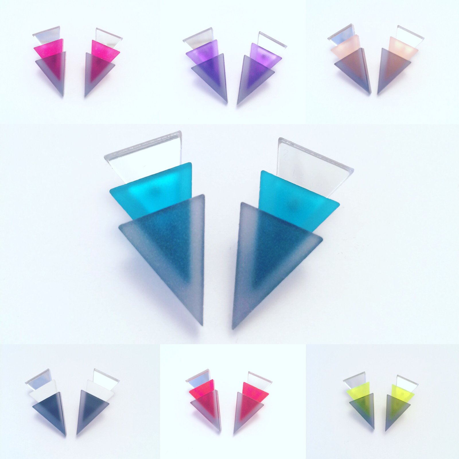 Tyto náušnice jsou kombinací zrcadlového stříbrného podkladu, prostřední je jedna z 6 barev a vrchní vrstva je šedá.