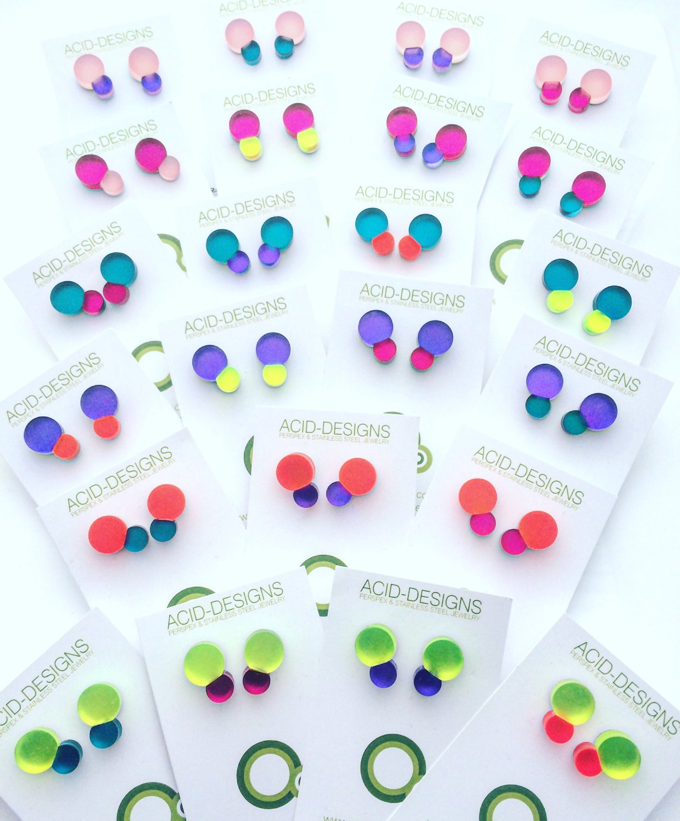 Tyto náušnice jsou vyrobeny ze dvou vrstev - barevného perspexu a podkladem ze zrcadla z perspexu , barvy jsou tak výraznější a mají velmi působivé odlesky.