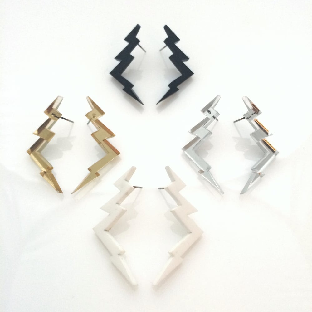 Extravagantní náušnice Thunder jsou dostupné ve 2 zrcadlových odstínech - stříbrná a zlatá a ve dvou barevných - matná bílá a matná černá.