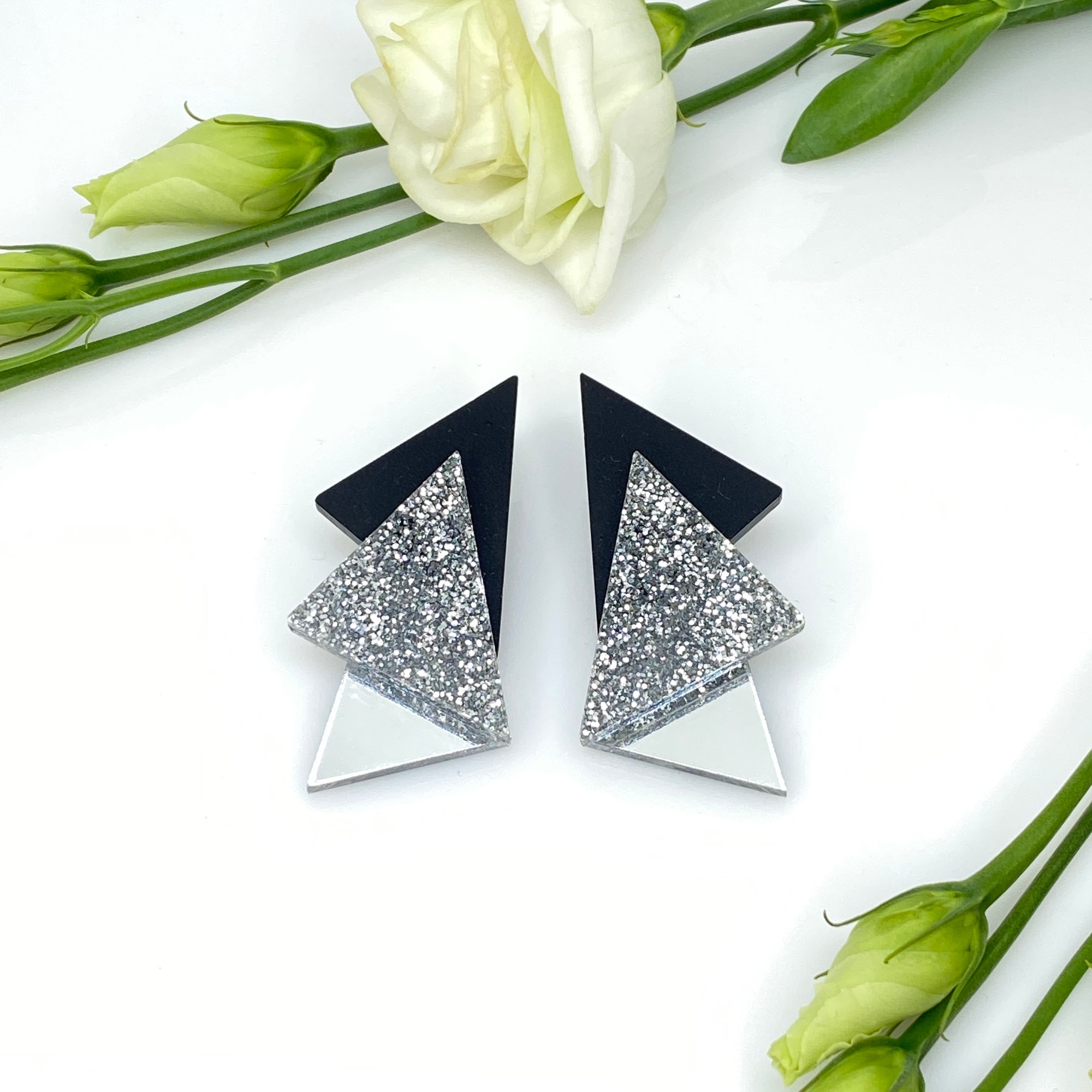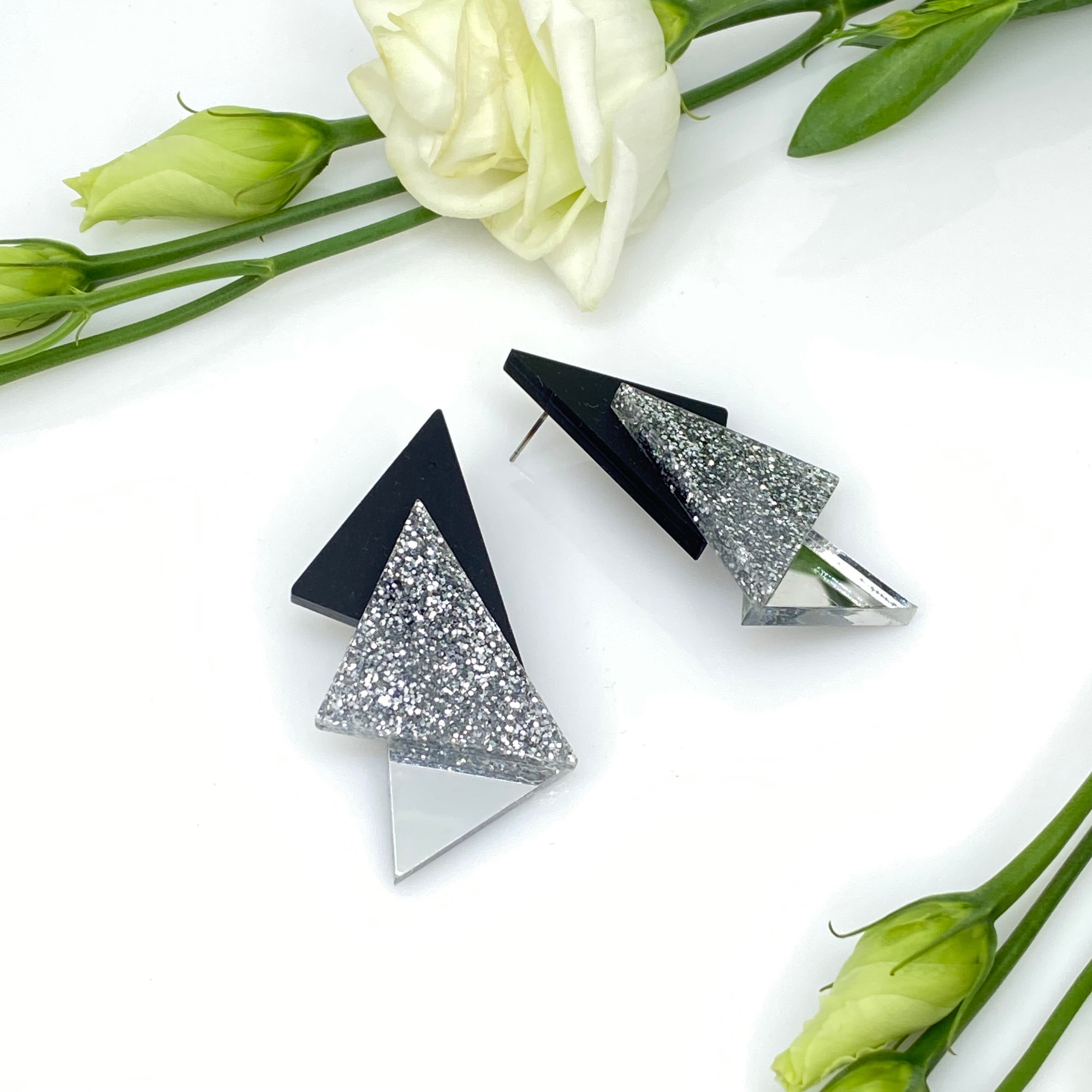 Elegantní náušnice, které na Vás okolí nepřehlédne. Buďte hvězdou s tou kombinací stříbrných třpytek ,černého matné a lesklého stříbrného zrcadla. Jistě si je zamilujete.
