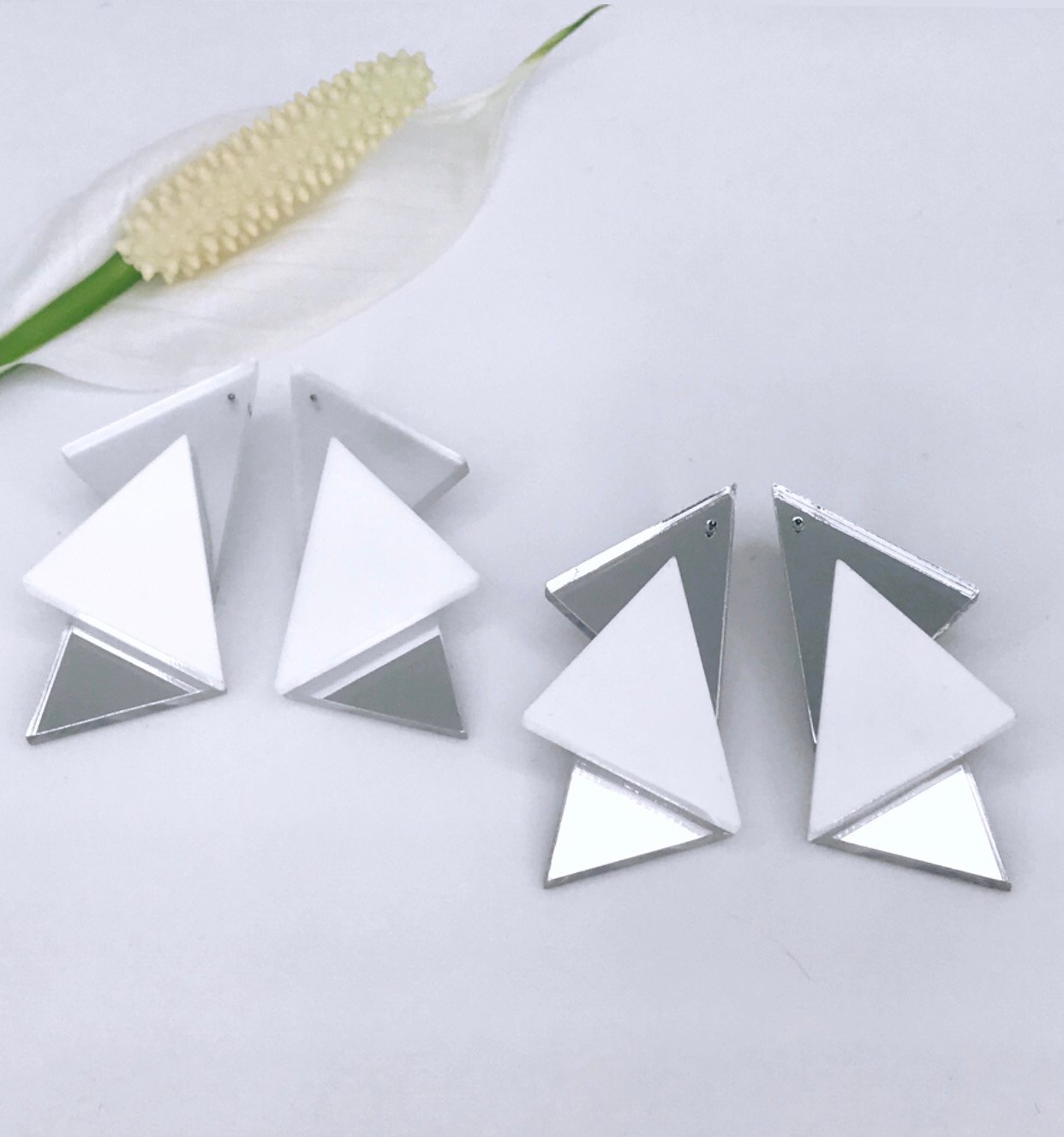 Puzetka je z hypoalergenní chirurgické oceli, do náušnice je zatavena, protidíl jen silikonový. Zadní strana je ošetřena ochraným lakem proti oděru zrcadla. Pravá a levá náušnice jsou navrženy tak aby Vám dominantní bílý trojúhelník opisoval křivky tváře.