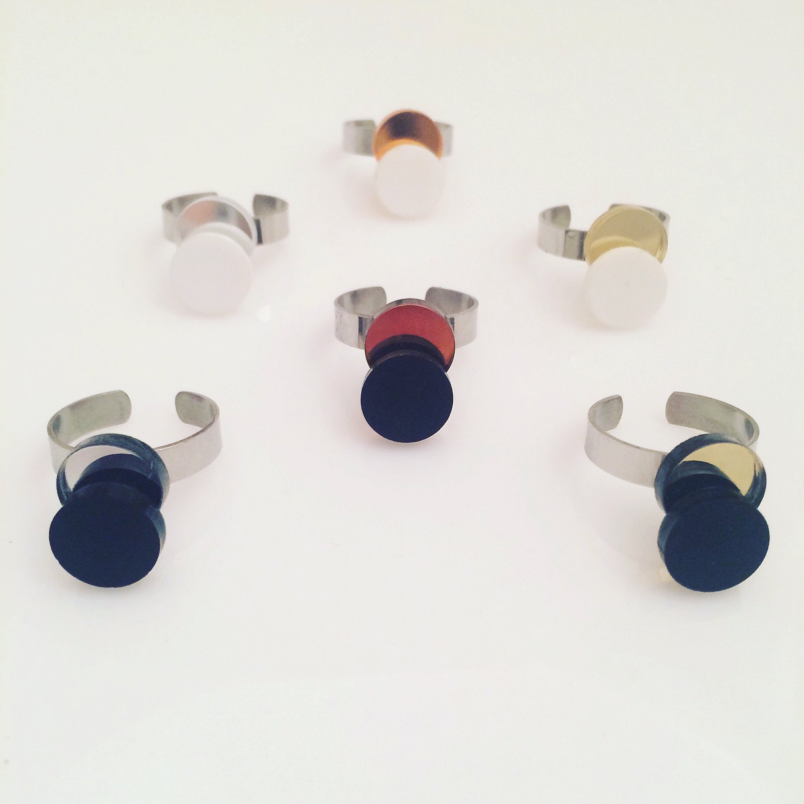 Materiál , který zdobí prsten je ze dvou vrstev perspexu - matné černé nebo matné bílé v kombinaci se zrcadlovou - zlatou, měděnou a stříbrnou.