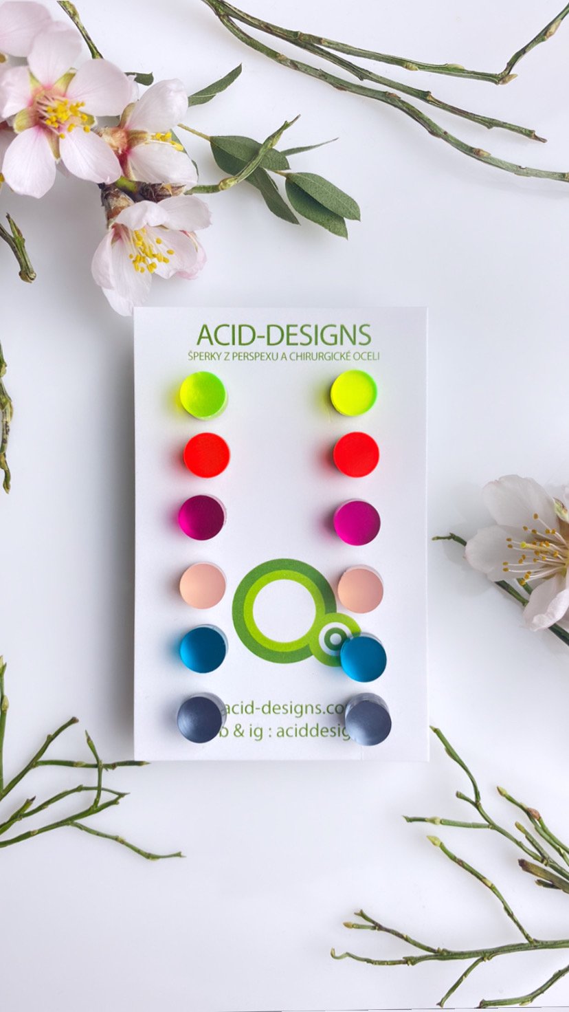 Set 6 párů náušnic / tyrkysová x fluorescentni zelená x fuchsiová růžová x starorůžová x fluorescentní oranžová x šedá. Rozměr náušnice 0,7cm. Puzetky z hypoalergenní chirurgické oceli , protidil silikonový.