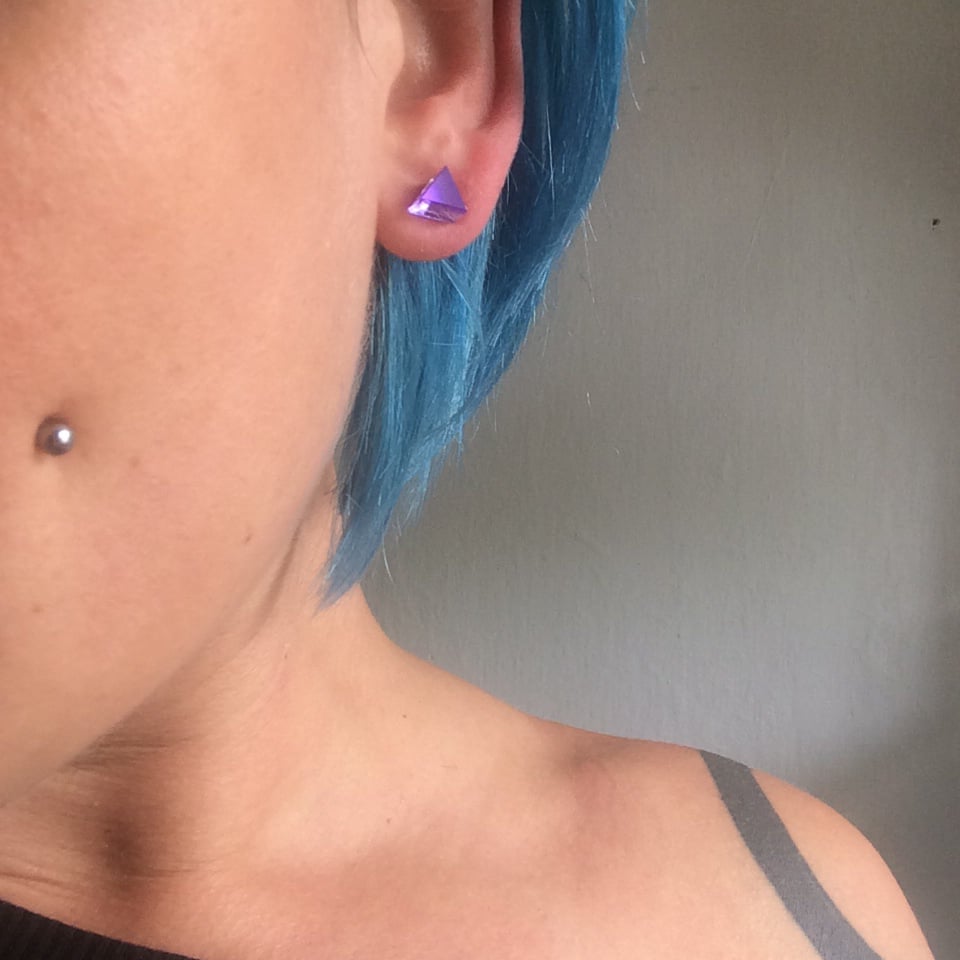 Tyto náušnice jsou vyrobeny ze dvou vrstev - barevného perspexu a zrcadla z perspexu , barvy jsou tak výraznější a mají velmi působivé odlesky.